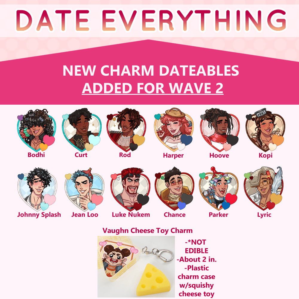 Charms and plush buttons featuring some of the amazing cast of characters from Date Everything!