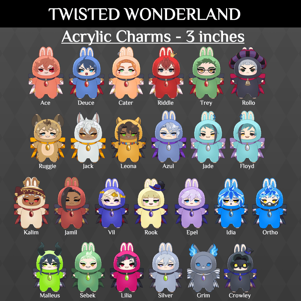 Acrylic charms of your faves from Twisted Wonderland as labubus!